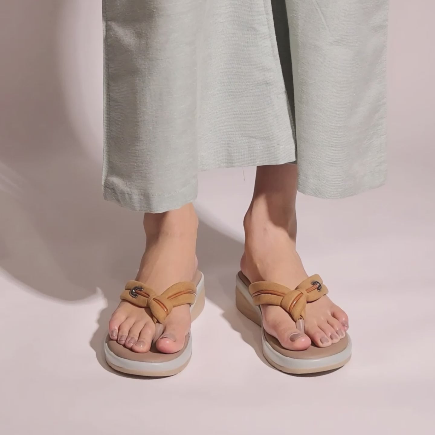 Experience effortless comfort with the Sand Beige Comfort Knot Thong Wedges, thoughtfully designed to blend everyday ease with modern sophistication. The smooth, soft upper features a stylish knot detail, adding a chic twist to a comfort-first silhouette. Built with an ergonomic dual-cushion footbed, these wedges provide superior support to your heel, knee, and hip joints, making them ideal for all-day wear. The lightweight wedge base ensures balanced elevation, while the anti-slip traction sole keeps every step stable. Perfect for daily outings, travel, or casual evenings, these wedges redefine understated elegance with all-day cushioning comfort.