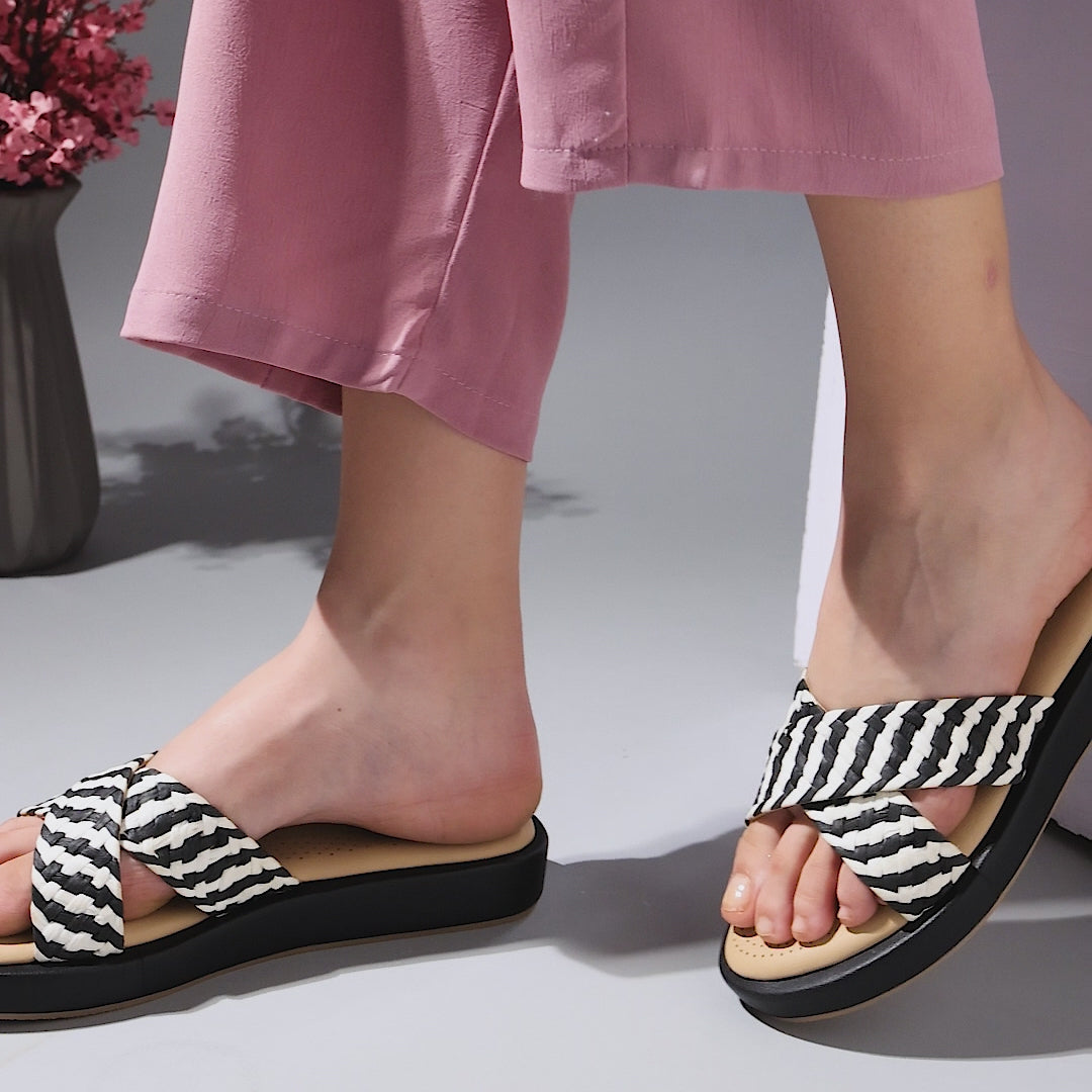 Add a playful touch to your casual wardrobe with these unique black sandals! Featuring a low platform heel and eye-catching diagonal stripes, these open-toe beauties are perfect for laid-back outings. The criss-cross strap design adds interest, while the synthetic material ensures durability. Ideal for women who appreciate a fun twist on everyday footwear, these slip-on sandals will elevate your basic casual look with effortless style.