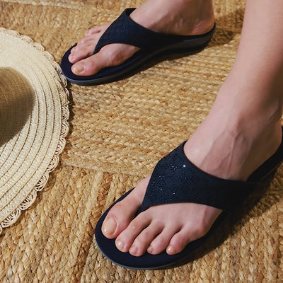 Indulge in casual comfort with these navy thong sandals for women. Crafted from soft suede, these flat sandals feature eye-catching stone work, creating an embellished pattern that elevates your basic casual look. The open-toe design and thong strap offer easy wear for any laid-back occasion. These aren't just sandals ñ they're your ticket to effortless style. Slip them on and experience the perfect blend of comfort and chic for your everyday adventures.