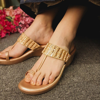 Make a grand entrance at weddings with these exquisite rose-gold heels. Featuring a medium wedge heel and intricate beading, they're perfect for special occasions. The synthetic material ensures comfort, while the embellished pattern and stone work add a touch of luxury. With their one-toe design and toe-separator strap, these heels are a fusion of style and tradition.