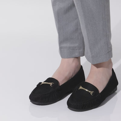 Step into sophistication with these black leather loafers. The matte finish and round-toe design offer a sleek look, perfect for workwear and everyday office attire. The slip-on style ensures easy wear, while the front chain detail adds a touch of elegance. These women's shoes combine comfort and style, making them ideal for long workdays. Elevate your professional wardrobe!