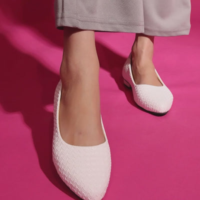 Step into effortless style with Kneetoes' white ballerinas. These almond-toe shoes feature a textured pattern and a subtle block heel, perfect for basic casual wear. The sleek design combines comfort and elegance, making them ideal for all-day use. With their versatile color and eye-catching texture, these ballerinas are a must-have for fashion-conscious individuals. Lightweight and flexible, they offer both style and comfort for your everyday adventures.